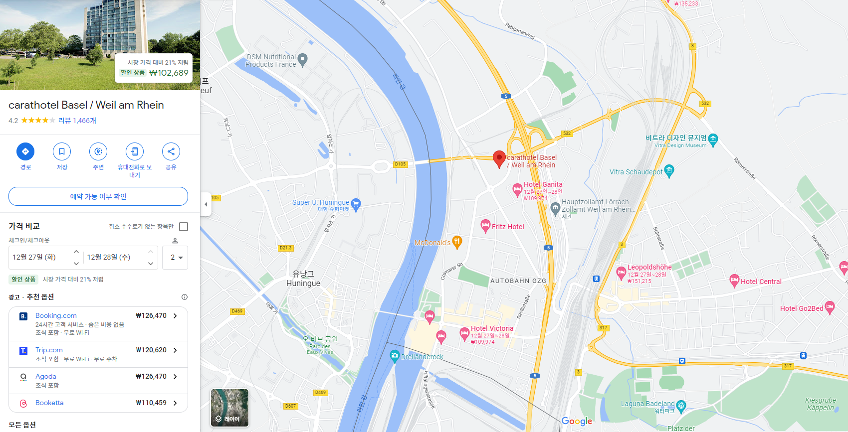 바젤 근처에 여러 숙소가 검색되는데, 저희는 독일의 캐럿 호텔 바젤(Carathotel Basel)에 숙박했습니다.